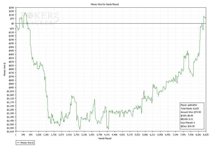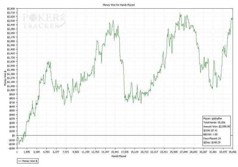 For the month in cash games I finished +$2,598.90 for 1.85PTBB/100 over 35,056 hands. I definitely lost money in tournaments this month too, though exactly how much I'm not quite sure. A couple hundred, maybe.